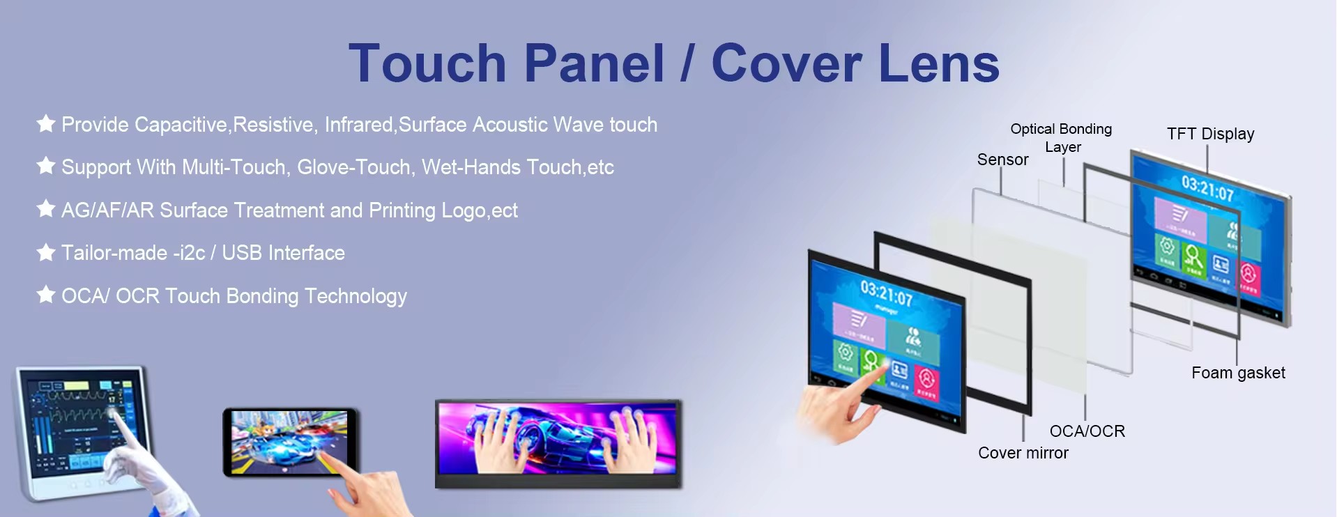 Rocktech offers semi-customization solution including interface, FPC, backlight, open frame, touch screen, cover glass etc.